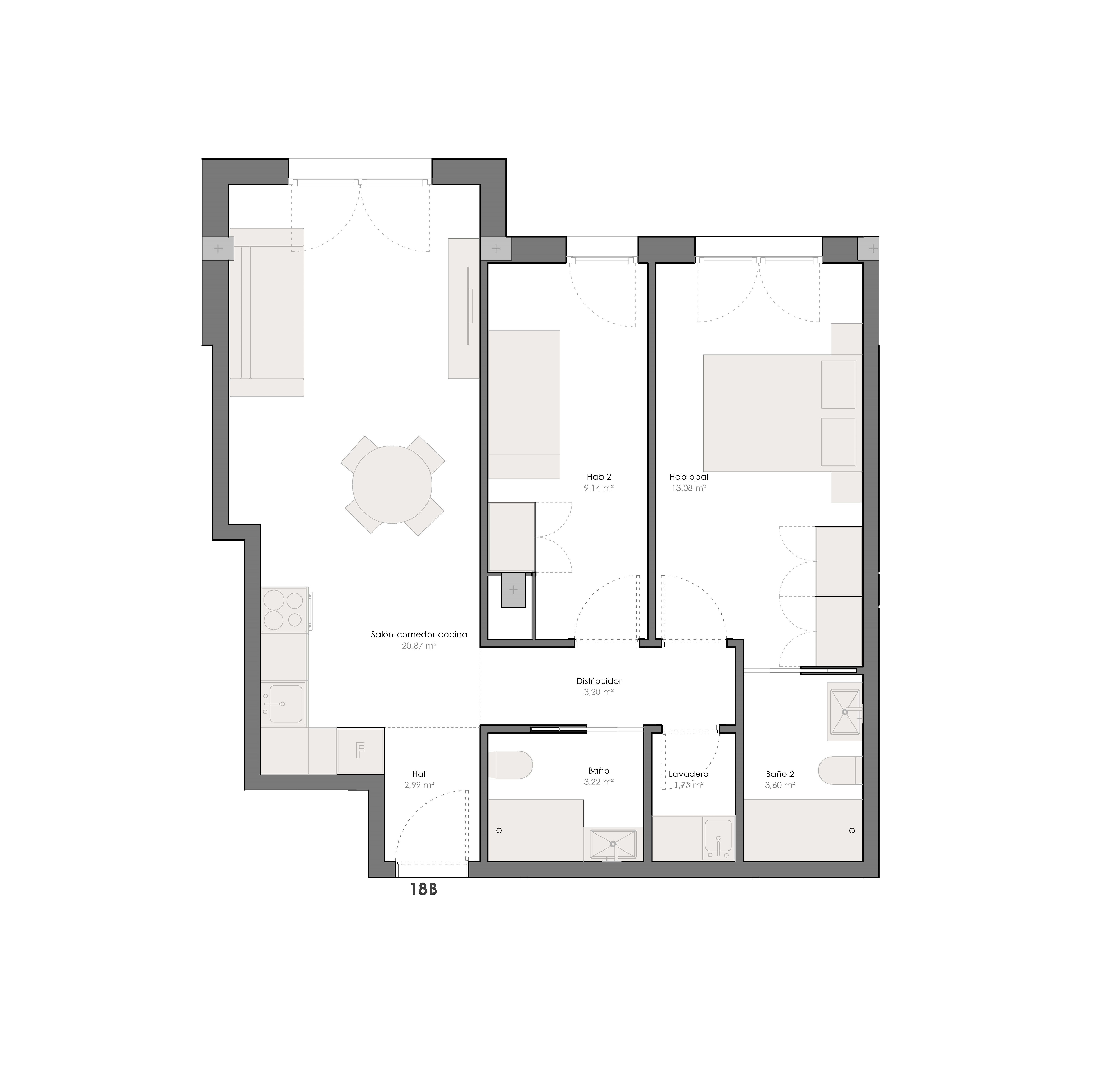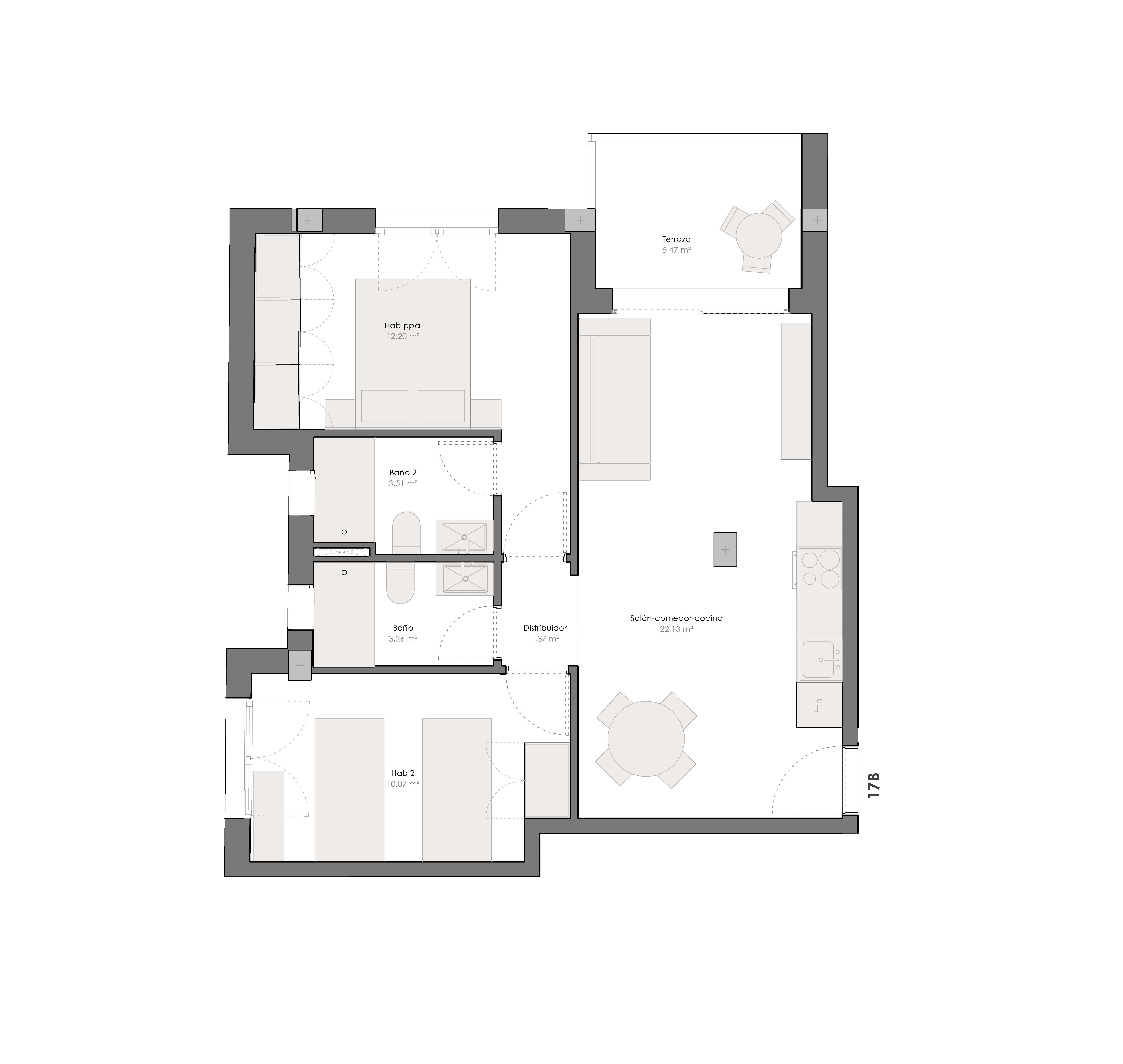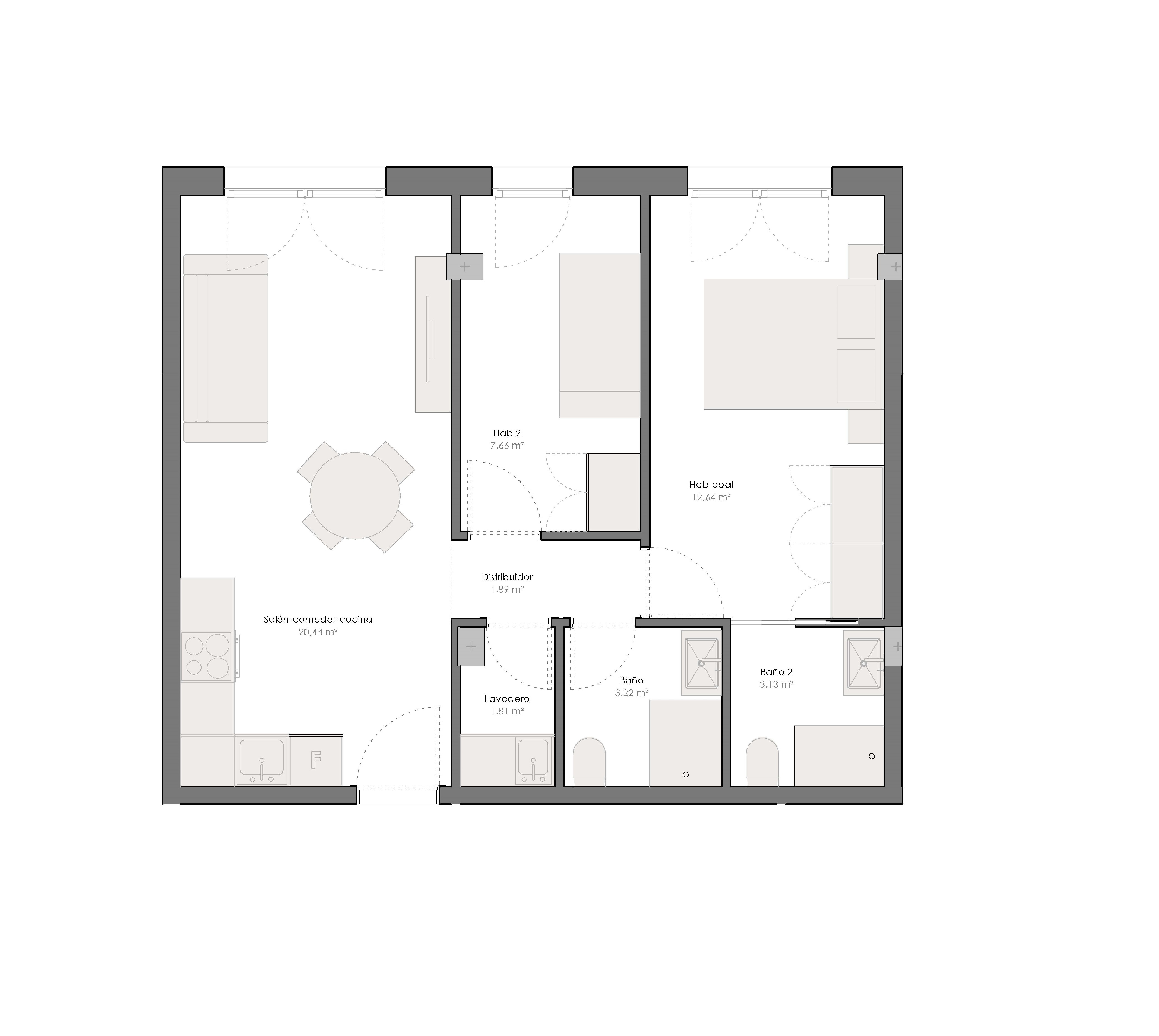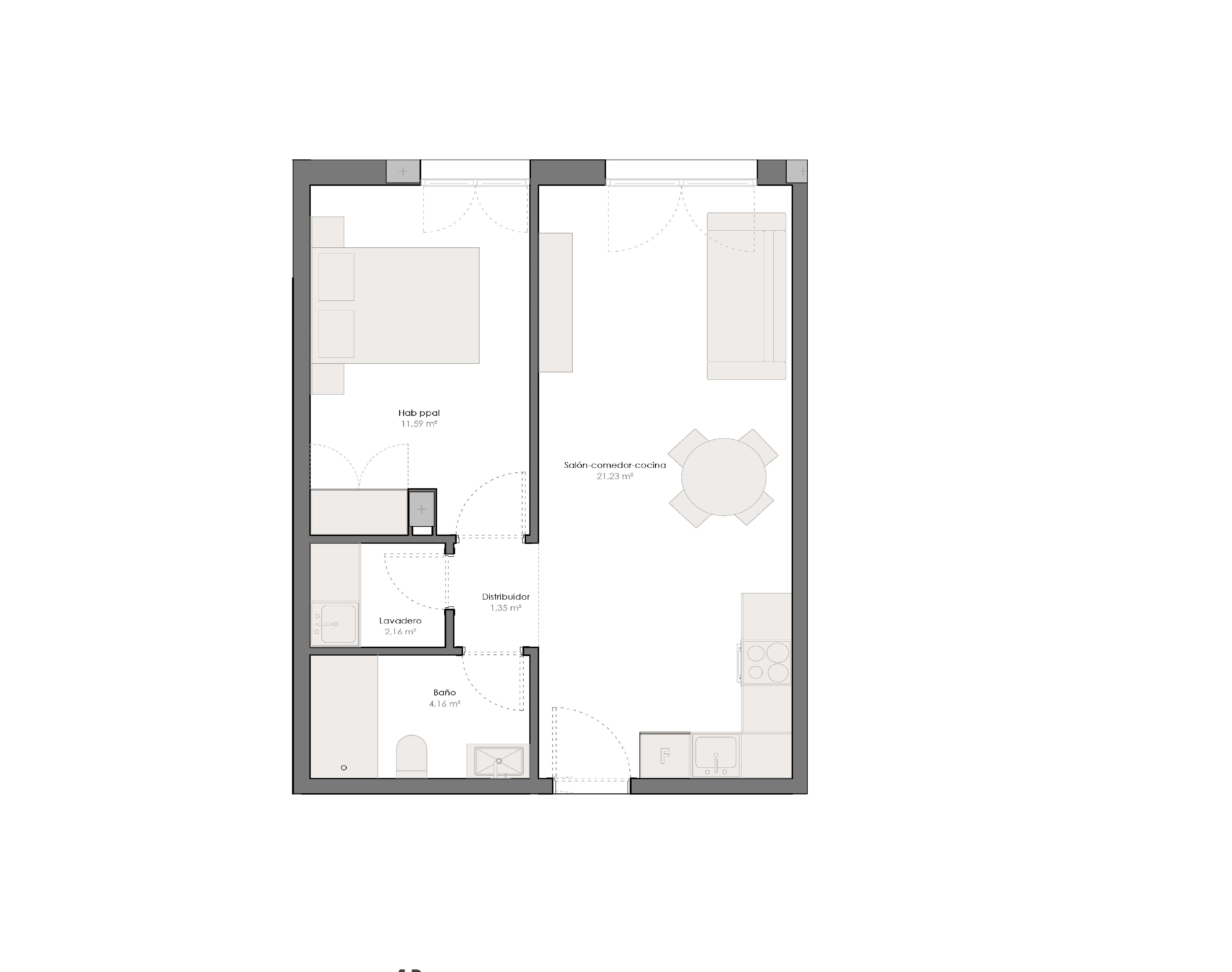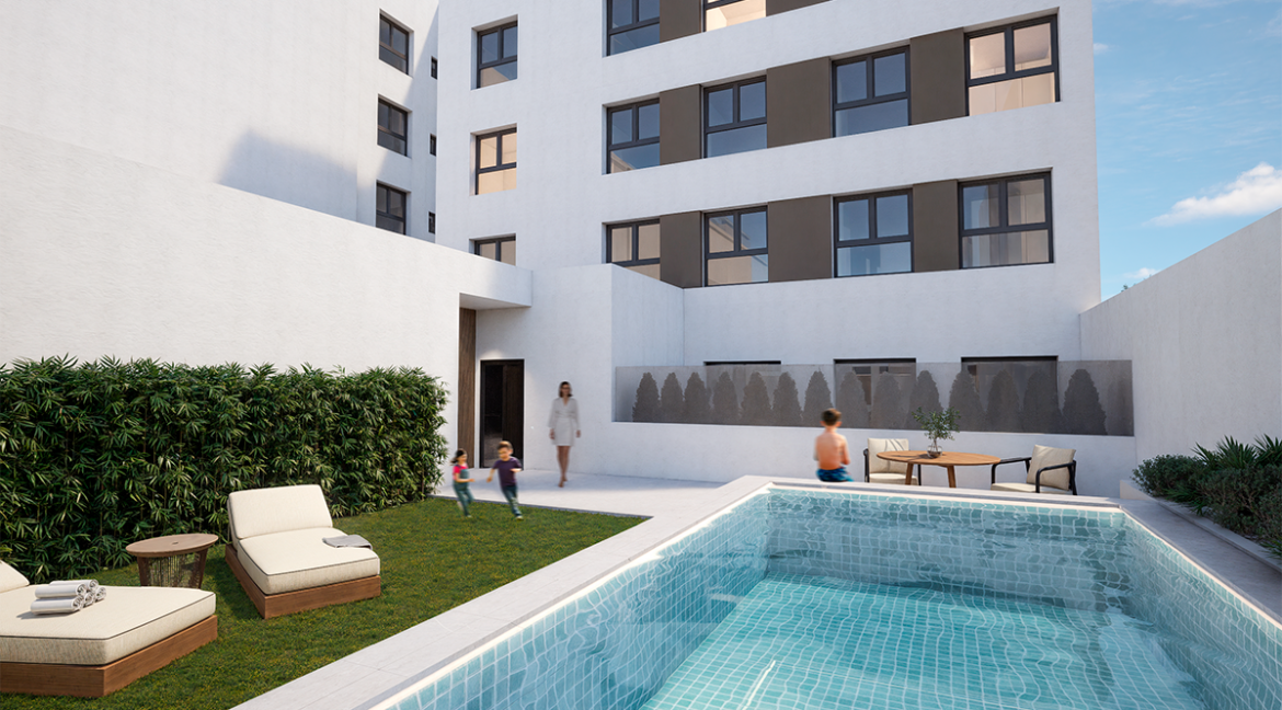 Además, se ha puesto especial énfasis en el diseño de las áreas comunes, creando un entorno accesible y armónico que fomenta la interacción social y el bienestar de los residentes. Los espacios comunes en esta planta se desarrollan en el patio de manzana donde se ubica una piscina comunitaria donde disfrutar y relajarse en los meses más cálidos.