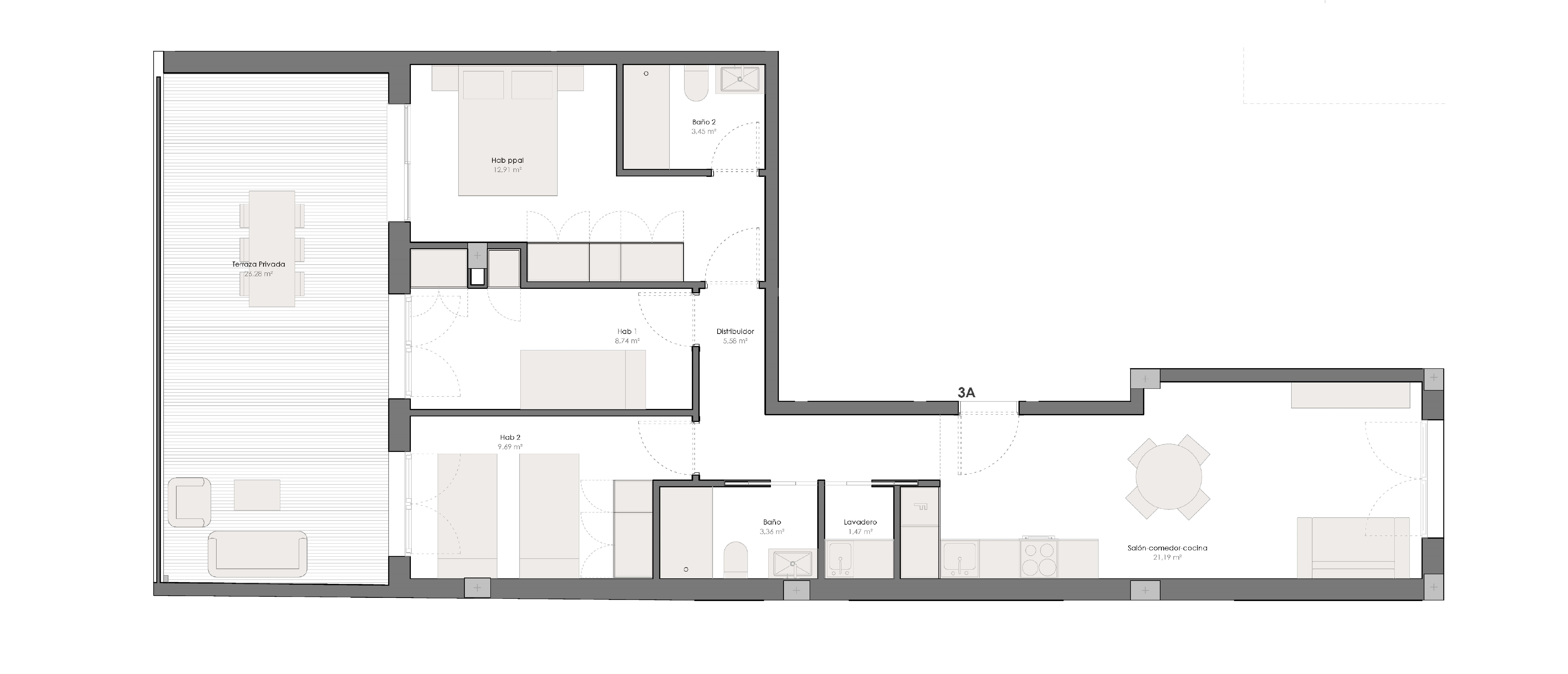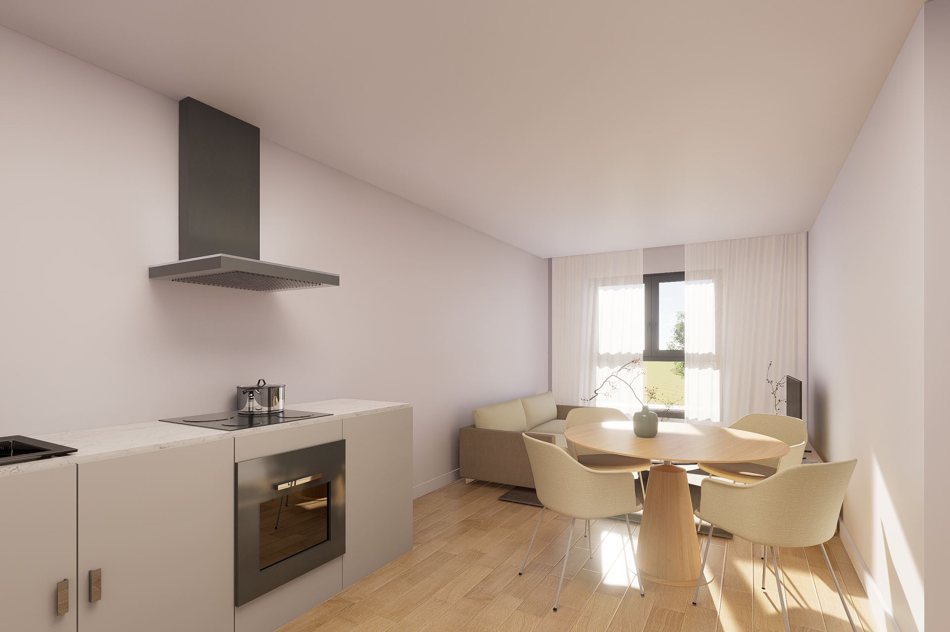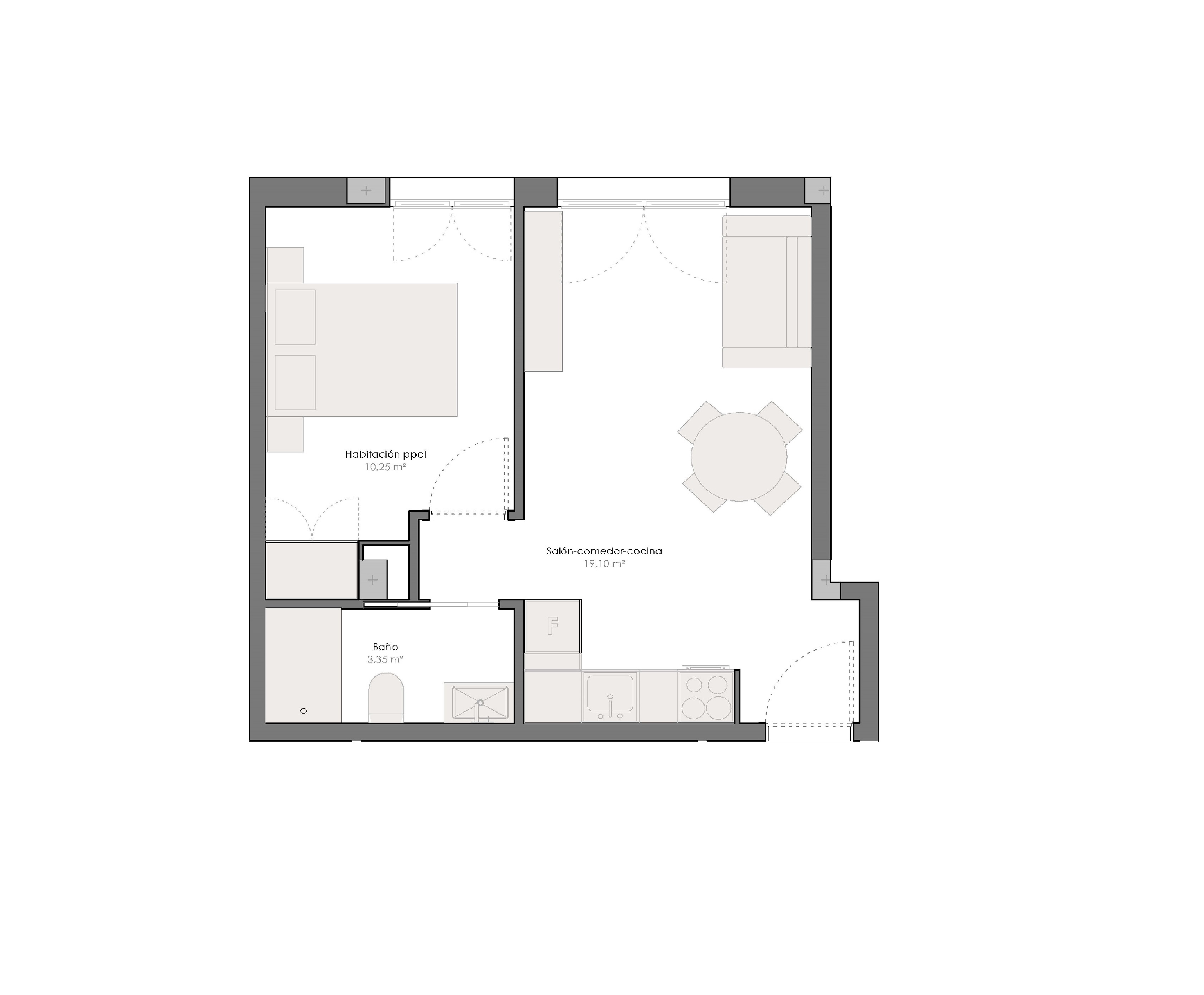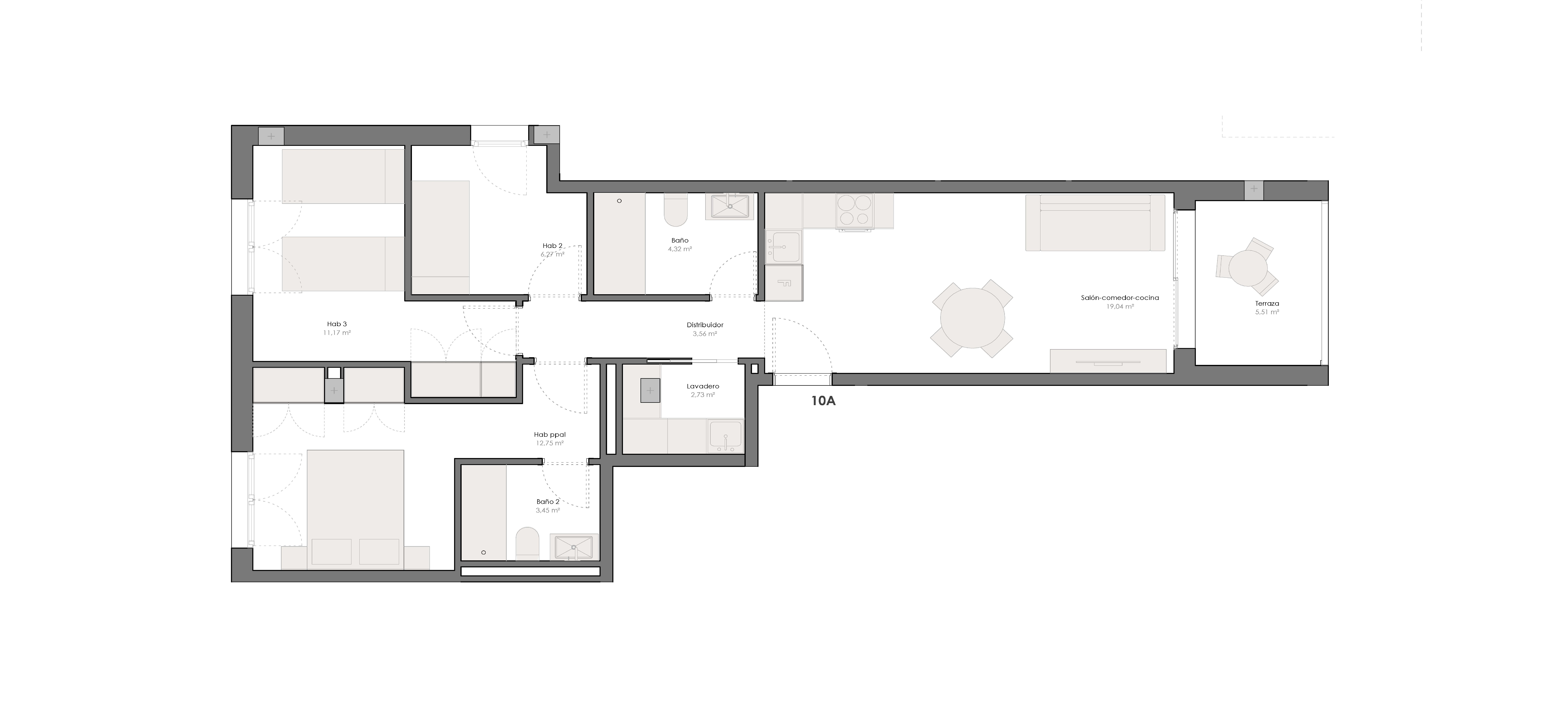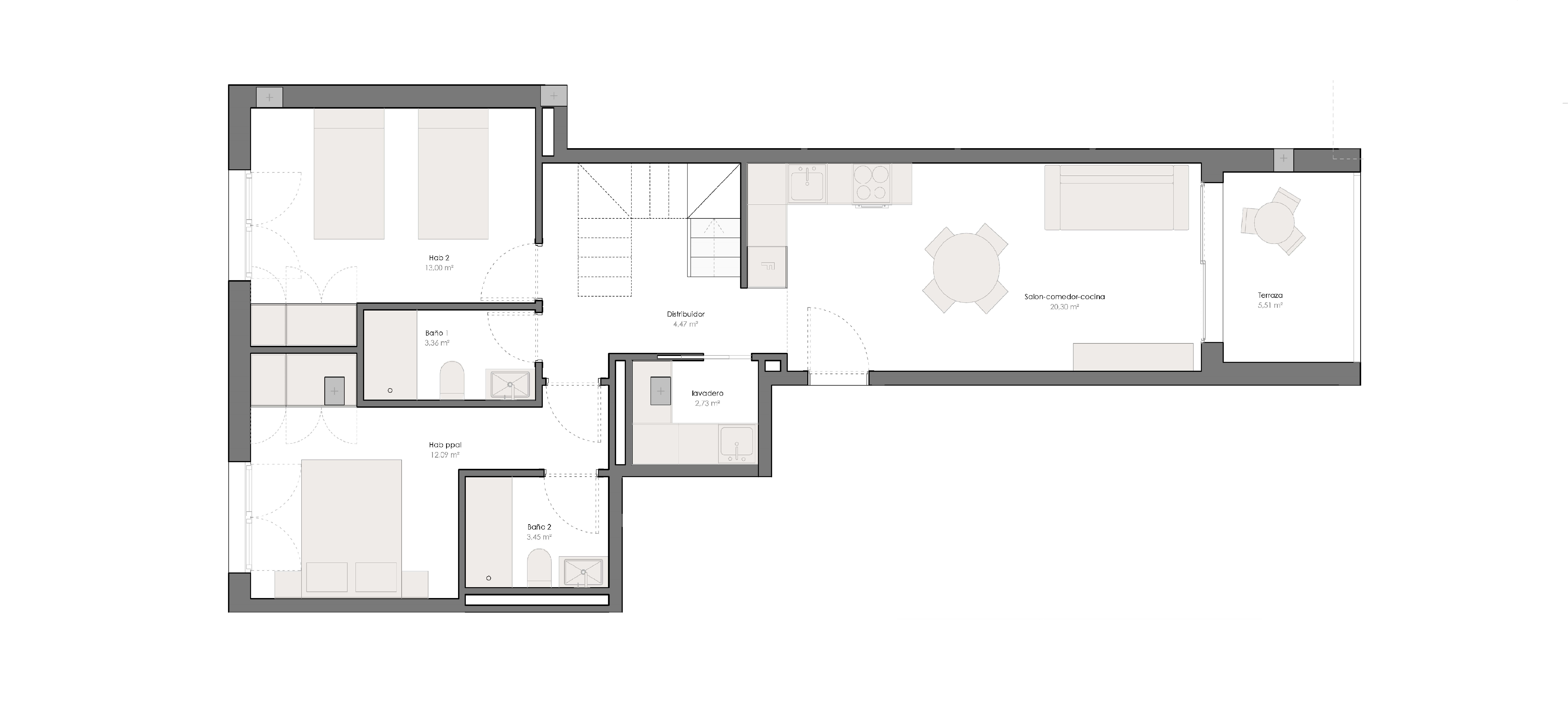 Además, se ha puesto especial énfasis en el diseño de las áreas comunes, creando un entorno accesible y armónico que fomenta la interacción social y el bienestar de los residentes. Los espacios comunes en esta planta se desarrollan en el patio de manzana donde se ubica una piscina comunitaria donde disfrutar y relajarse en los meses más cálidos.