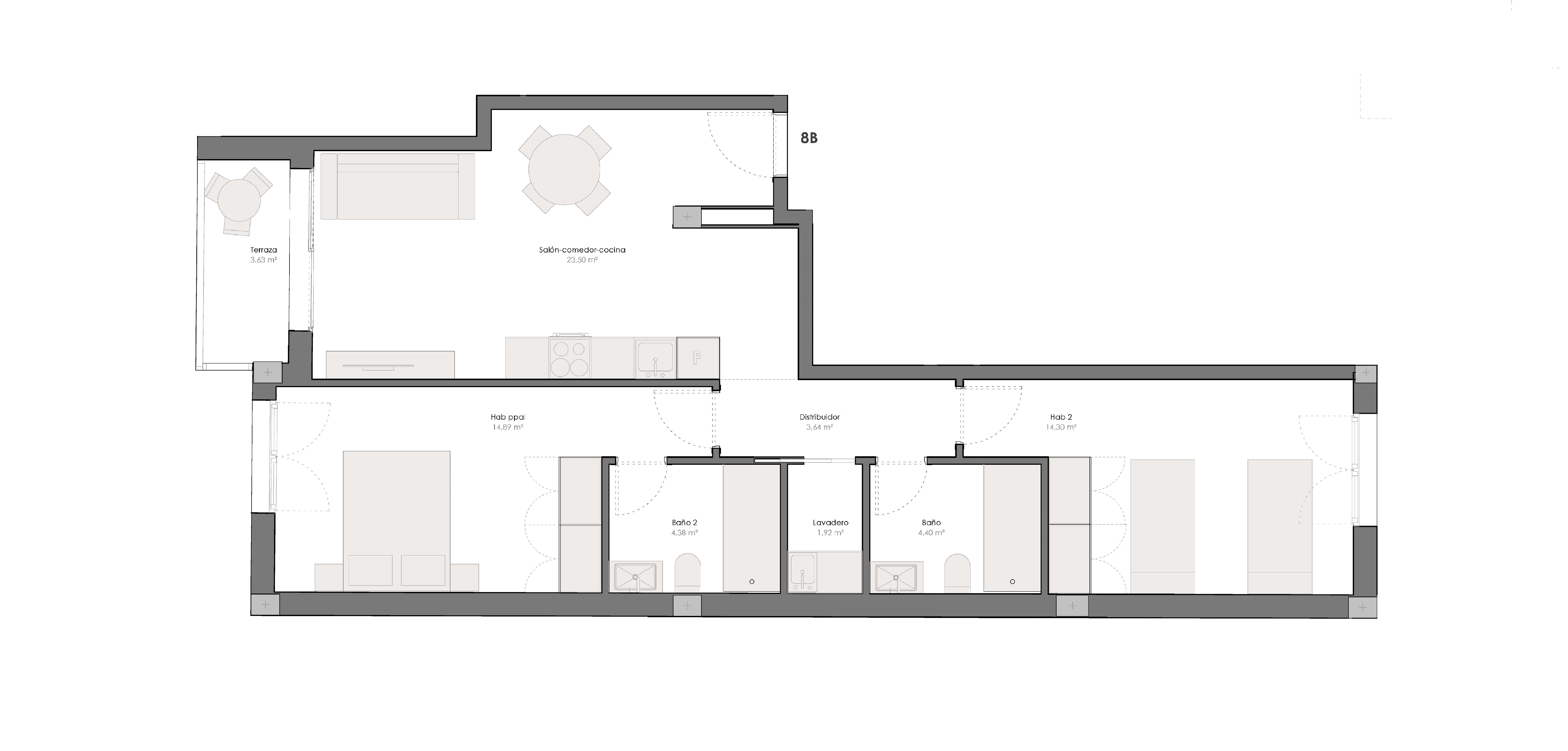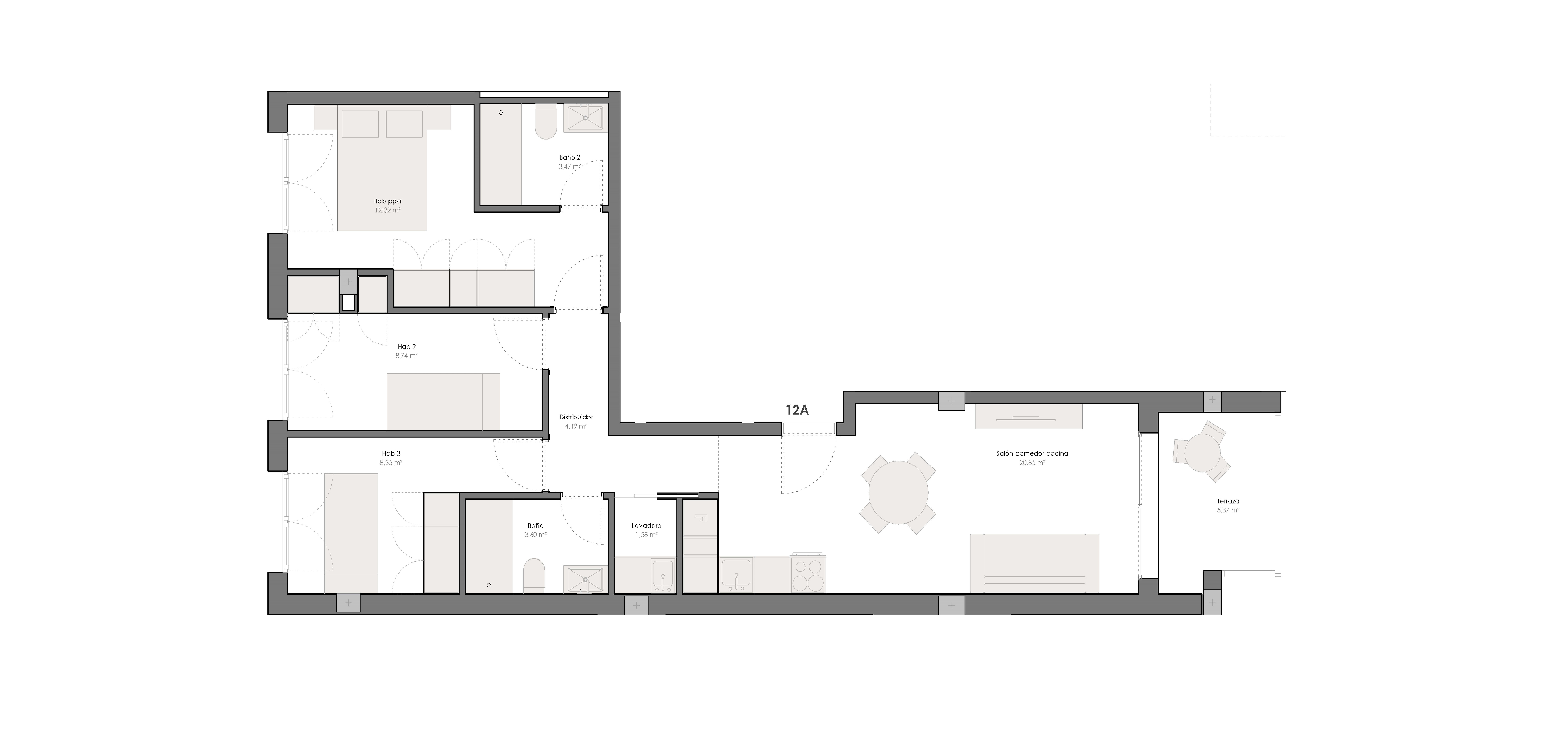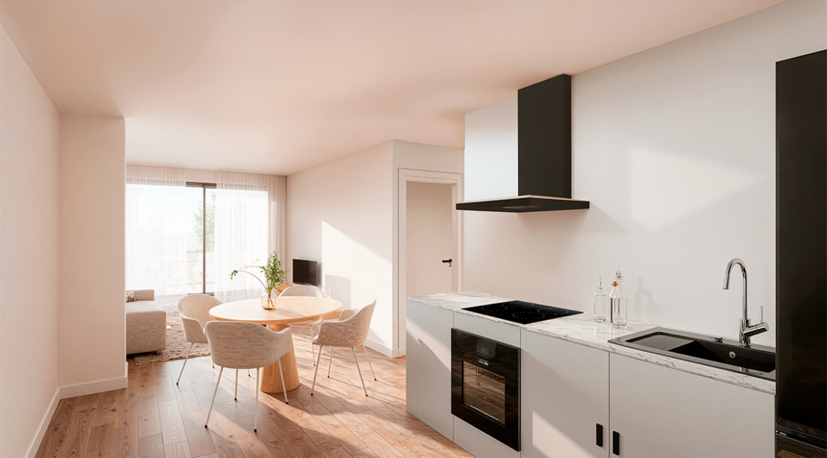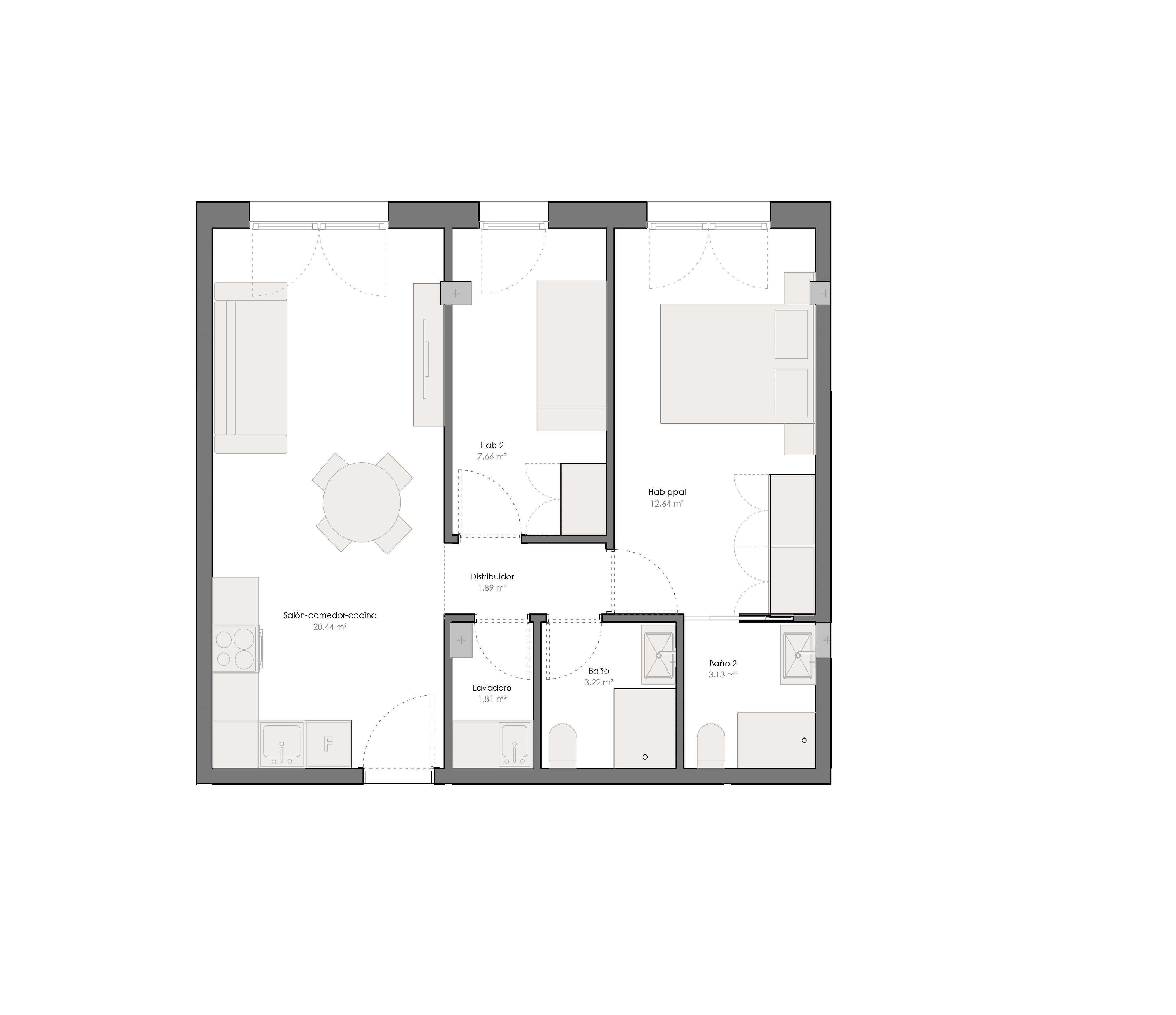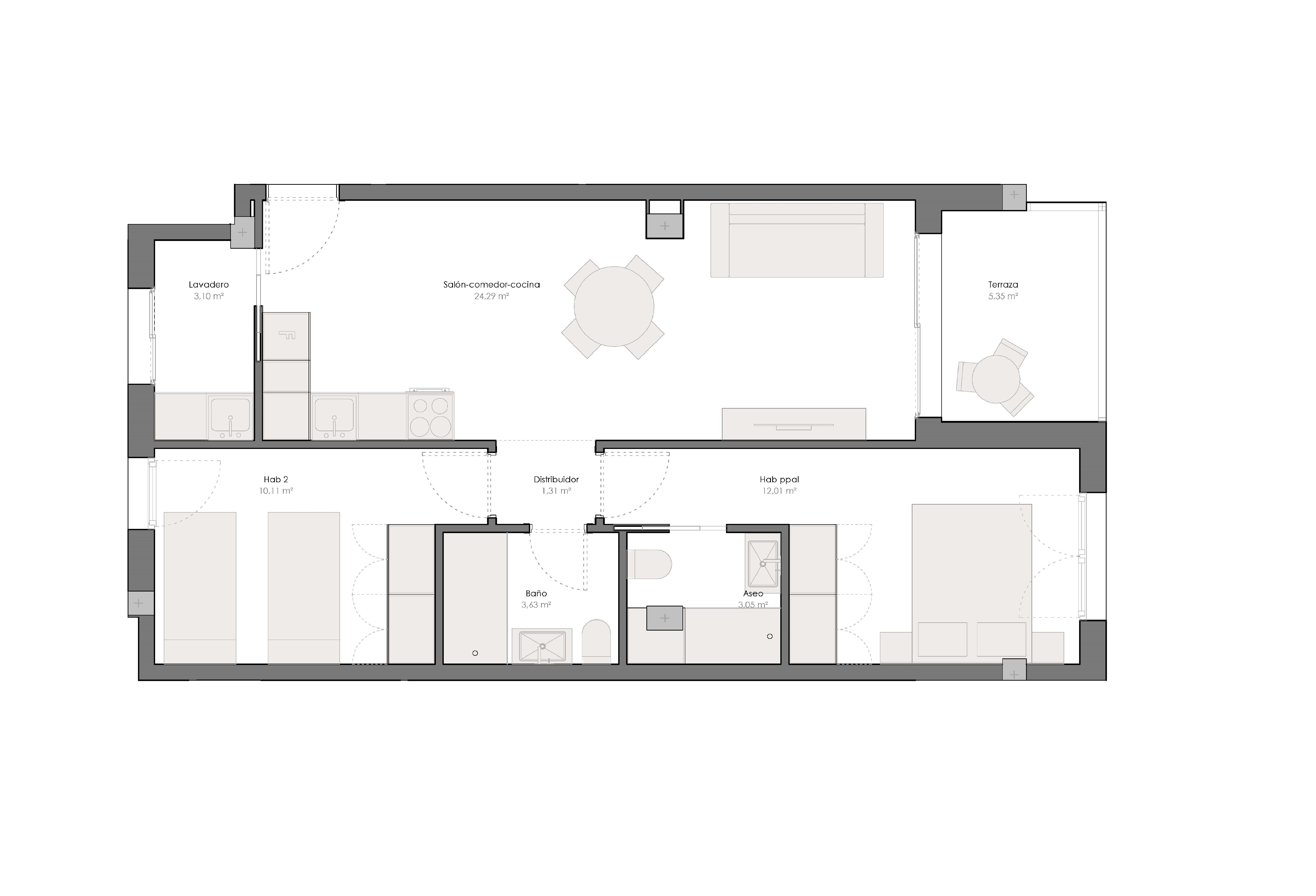 Además, se ha puesto especial énfasis en el diseño de las áreas comunes, creando un entorno accesible y armónico que fomenta la interacción social y el bienestar de los residentes. Los espacios comunes en esta planta se desarrollan en el patio de manzana donde se ubica una piscina comunitaria donde disfrutar y relajarse en los meses más cálidos.