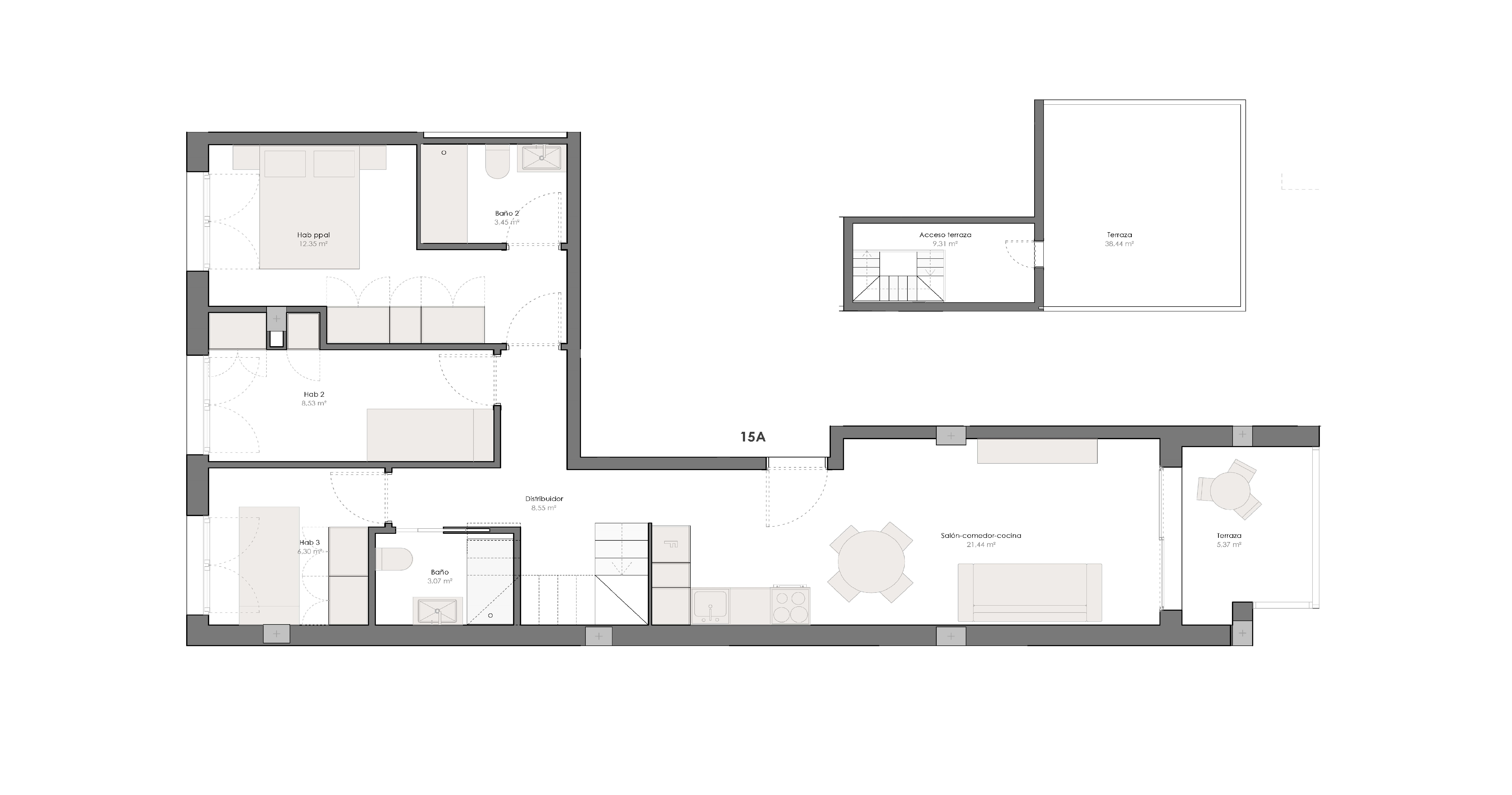 En la planta cuarta, las viviendas presentan con un concepto más exclusivo, con un bajo cubierta diáfana y terrazas privativas en el ático que ofrecen vistas panorámicas y la posibilidad de disfrutar de espacios al aire libre.