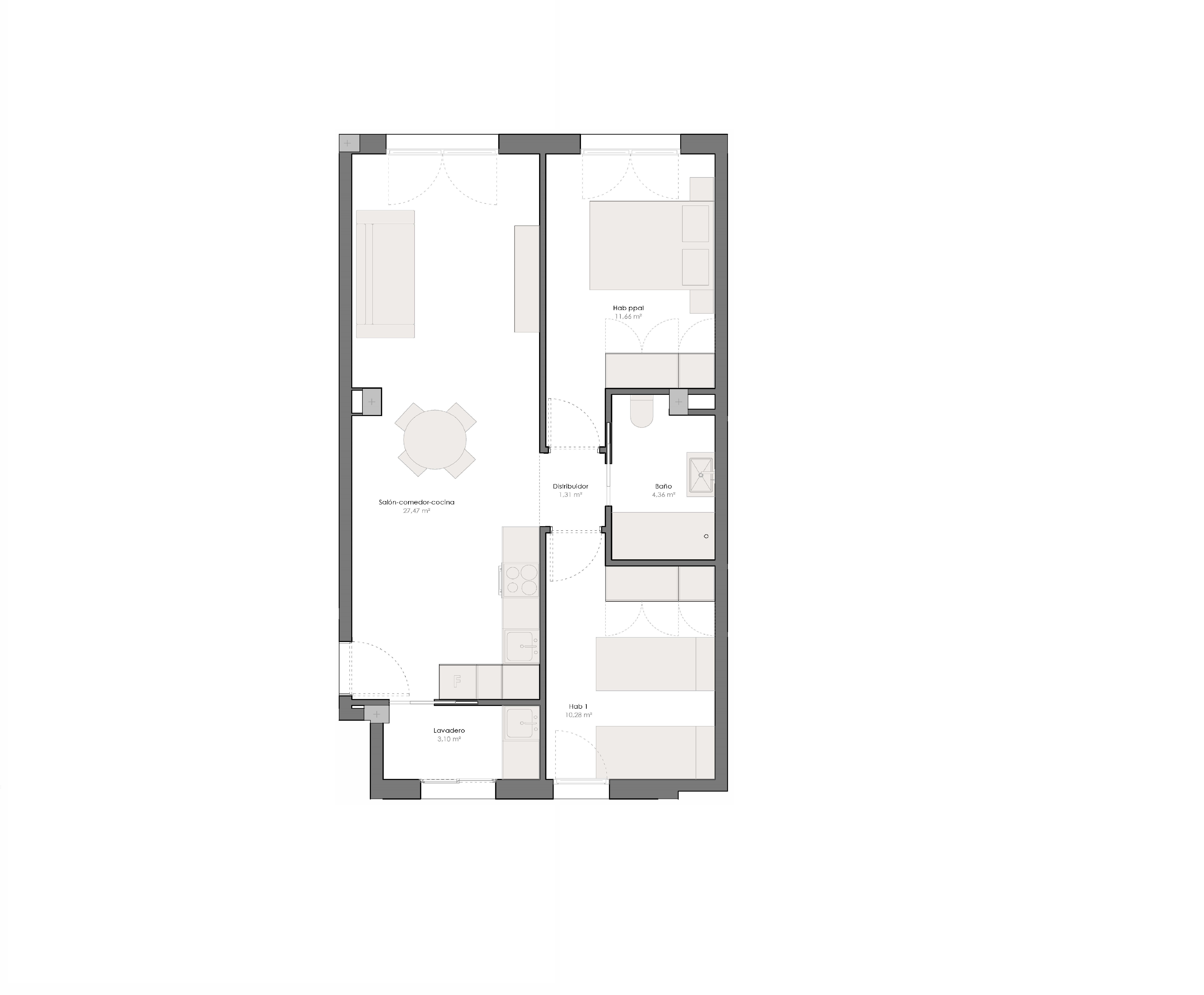 En planta baja, primera, segunda y tercera, las viviendas han sido diseñadas con un enfoque especial para ofrecer una calidad de vida excelente. Cada una de estas viviendas han sido pensadas para aprovechar al máximo los espacios y generar sensaciones de amplitud y confort. Estas viviendas destacan por la integración de un salón-comedor-cocina espacioso que favorecen la funcionalidad y la convivencia.