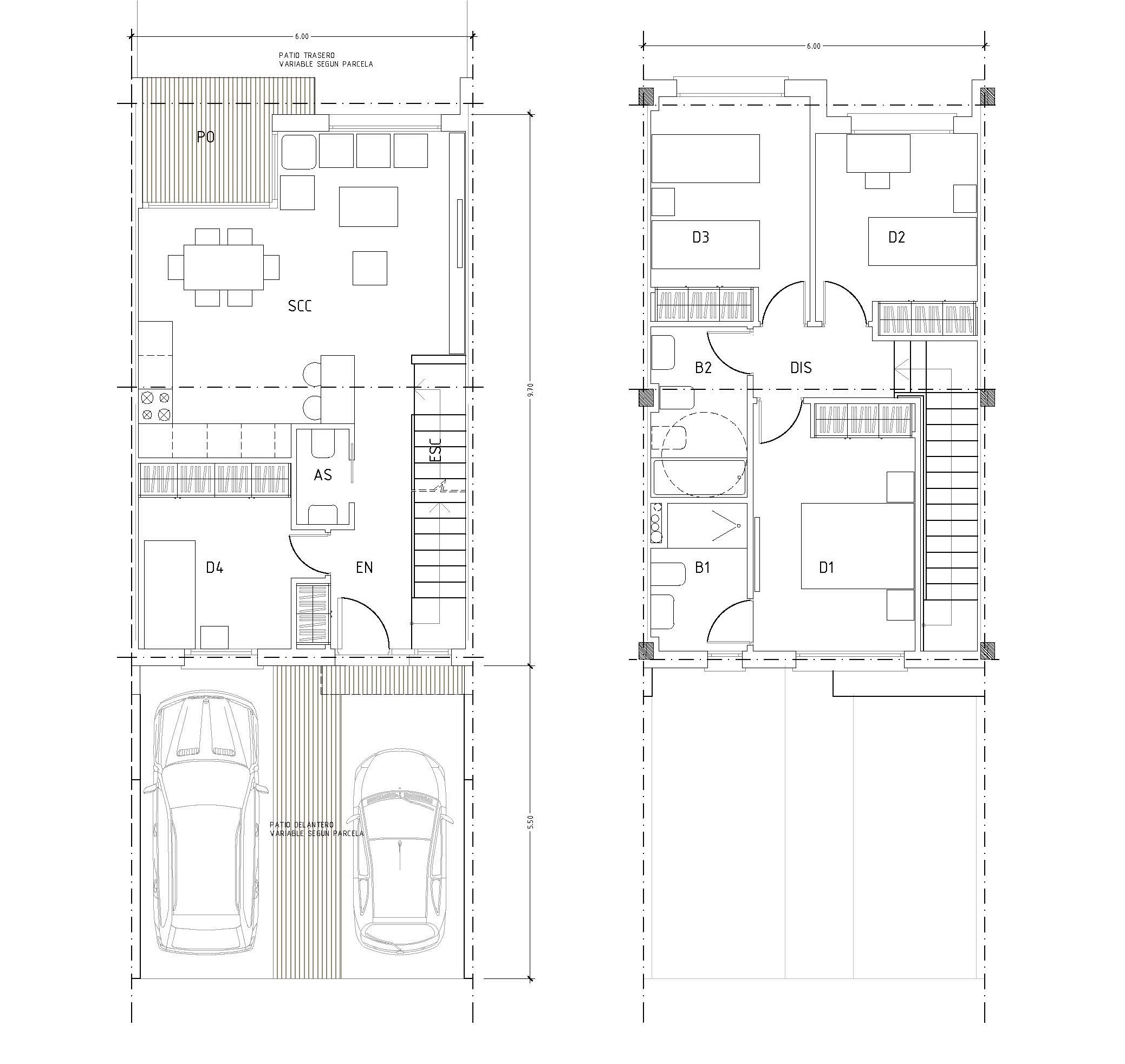 La distribución de los chalets contará con garaje delantero para dos coches, ya entrando en la vivienda, en planta baja, habitación despacho, aseo e instancia salón cocina integrados, con salida al patio traseros, en planta alta, tres habitaciones, dos baños, uno integrado en la habitación principal.