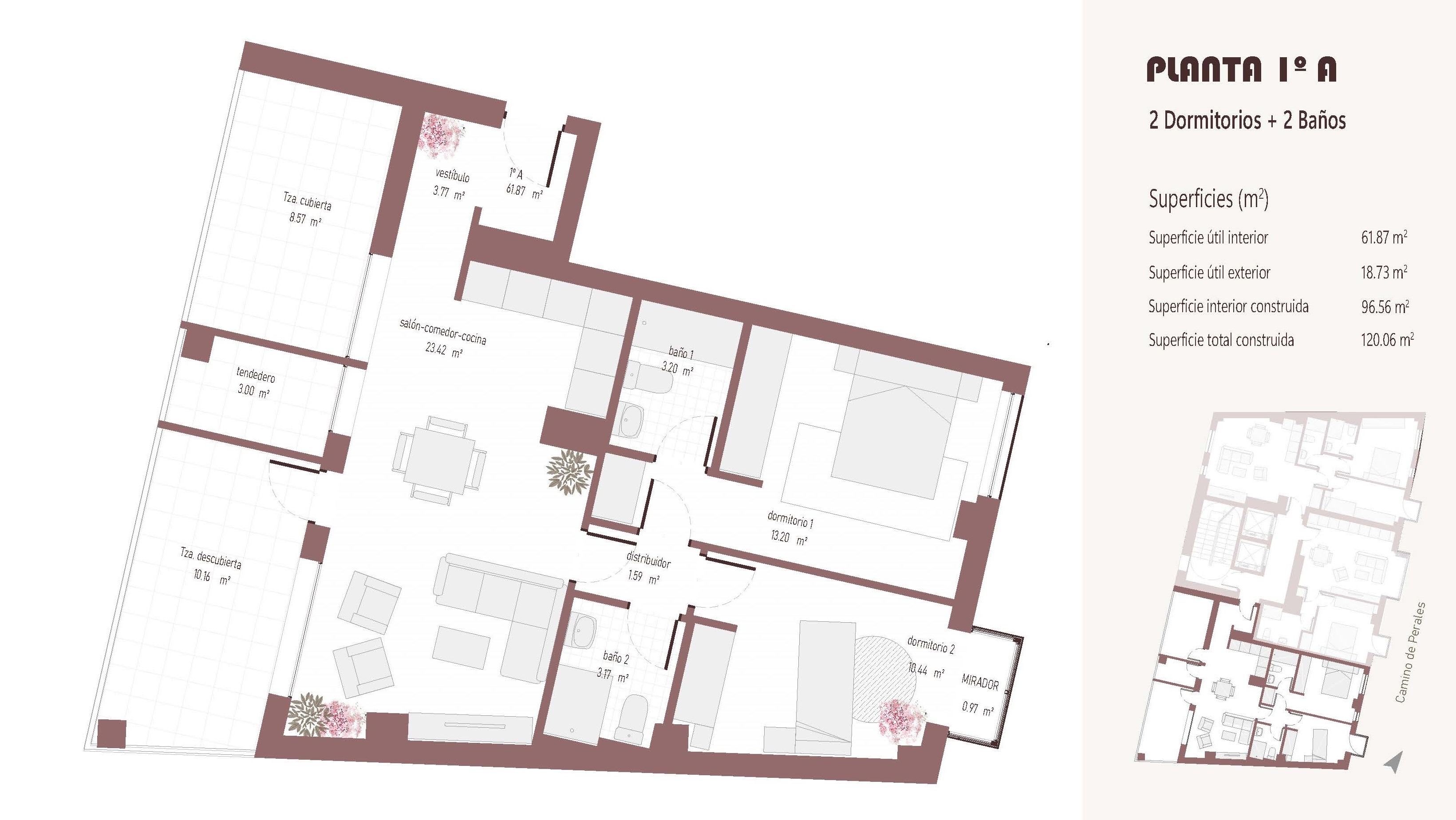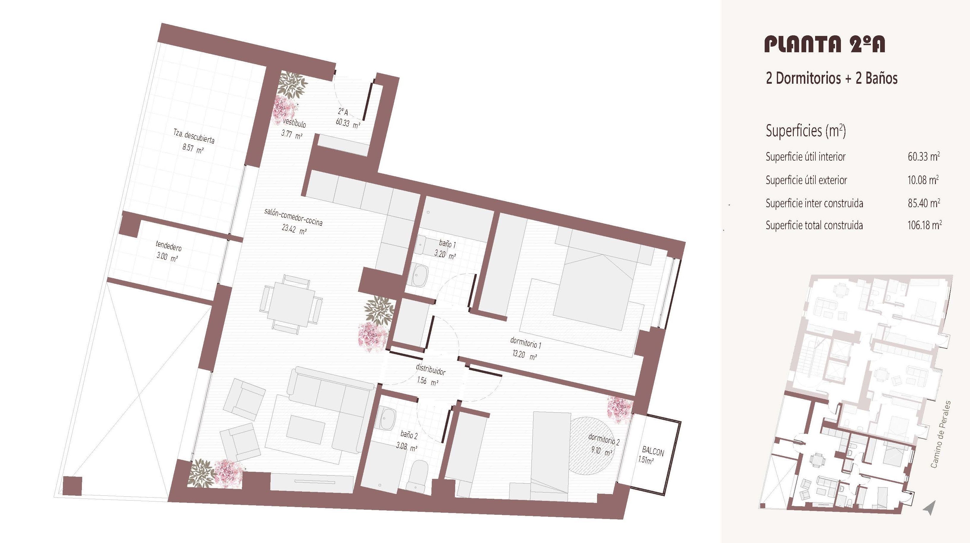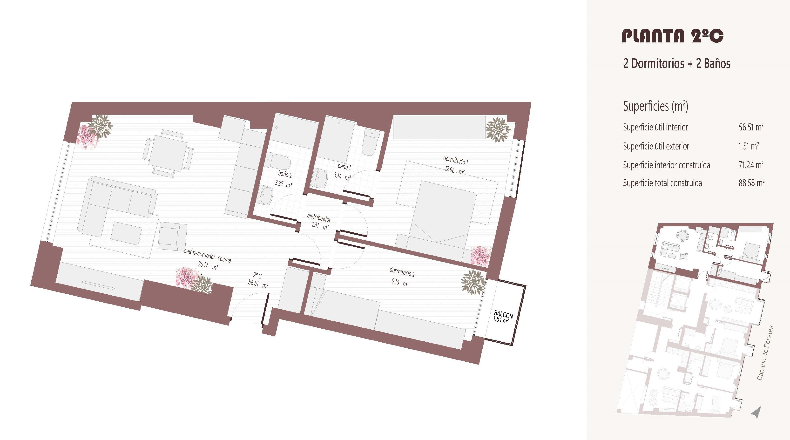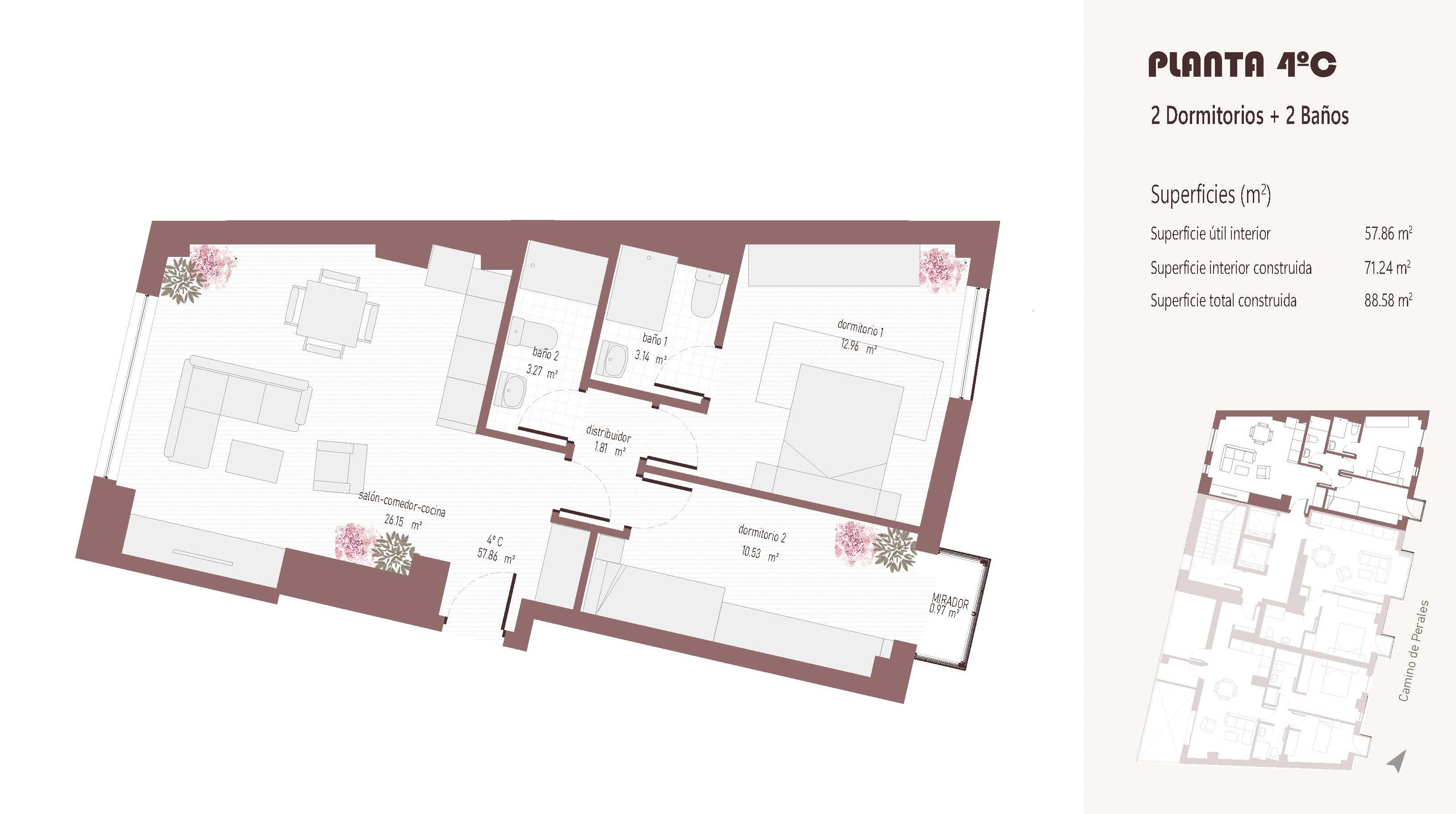 Este Residencial, se ubicará en la calle Camino de Perales 26, Madrid y contará con 16 exclusivas viviendas de 1, 2 y 3 dormitorios, bajo con jardín y 2 áticos, en urbanización privada con zona común y piscina. El Residencial cuenta además con 27 plazas de garaje y 16 trasteros, en el sótano del edificio.
