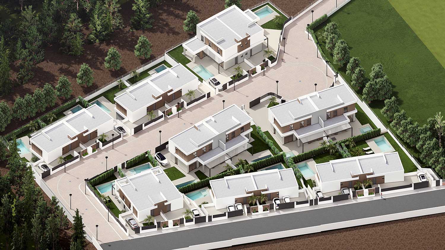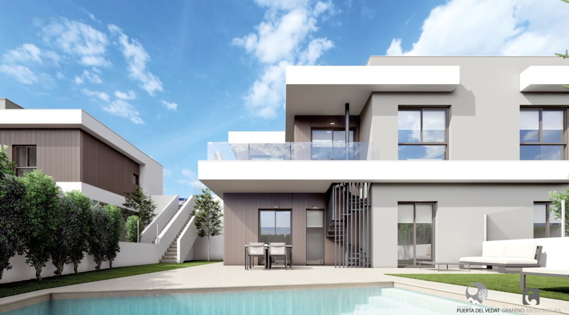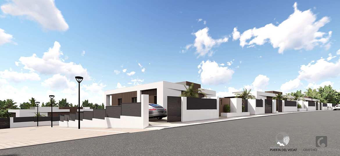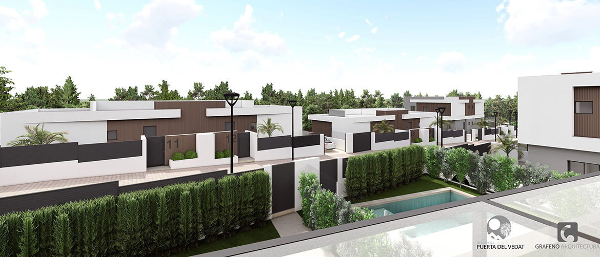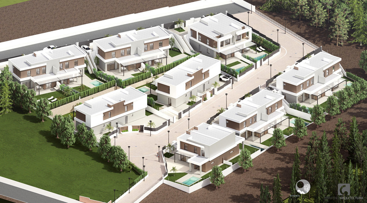 La promoción se diseña como un complejo cerrado privado y exclusivo de 2 viviendas unifamiliares pareadas formando un conjunto total de 16 viviendas que disponen de sus propias piscinas, jardines y aparcamientos en un entorno agradable