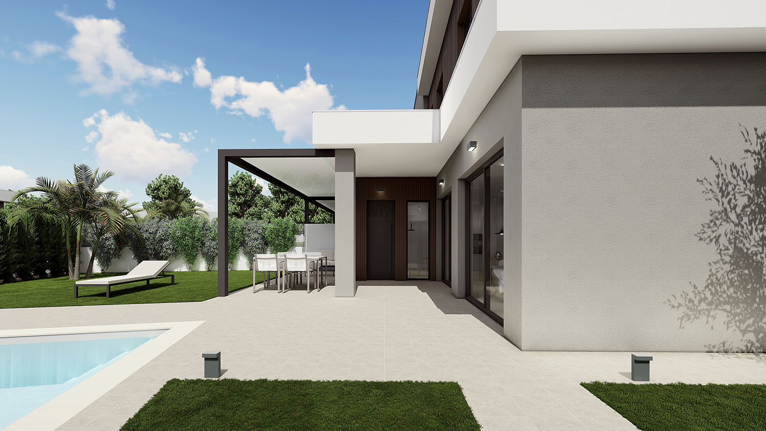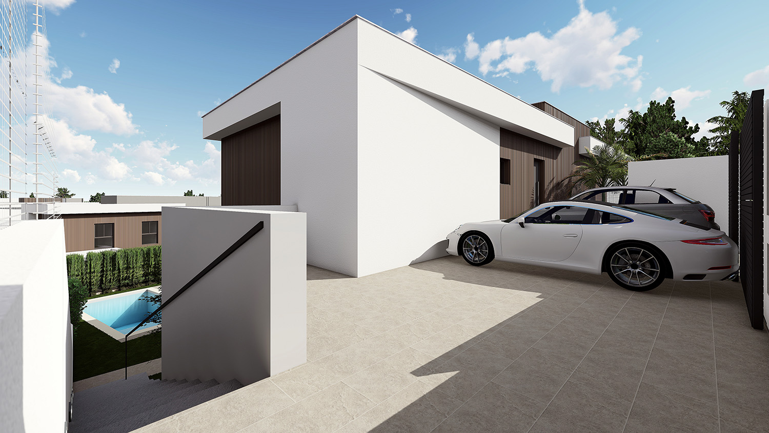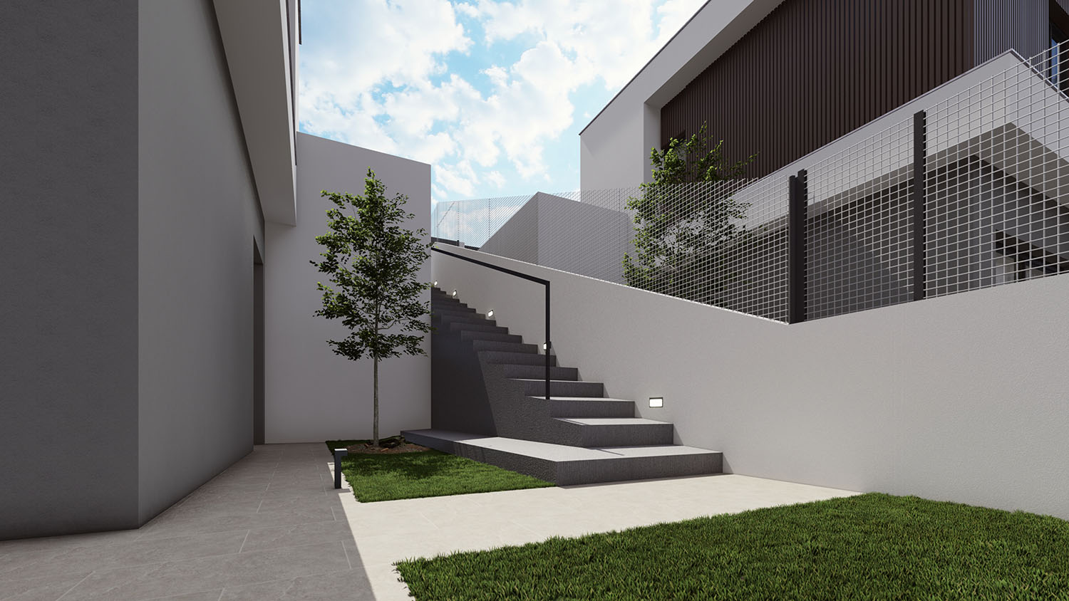 La promoción se diseña como un complejo cerrado privado y exclusivo de 2 viviendas unifamiliares pareadas formando un conjunto total de 16 viviendas que disponen de sus propias piscinas, jardines y aparcamientos en un entorno agradable