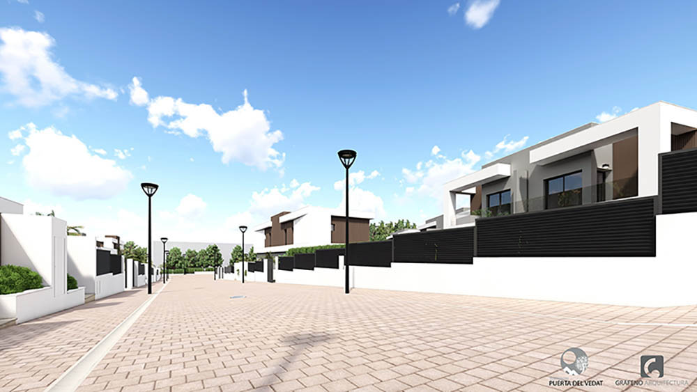 Las viviendas se diseñan, optimizando los espacios, con la máxima calidad de sus acabados, trasmitiendo sensaciones de confort. Todas las viviendas vuelcan al espacio común del complejo, comunicadas a través de un vial adoquinado, formando calles y accesos. Su diseño interior está pensado en la forma actual de cómo se habita en una vivienda, teniendo los espacios de salón, comedor y cocina, interconectados de una manera u otra, para de ese modo poder estar en contacto y pasar momentos en familia.